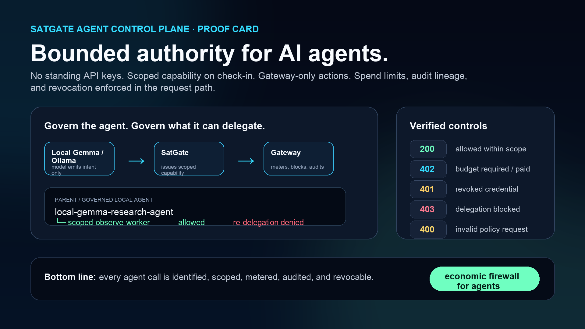 SatGate turns agent authority into a governed business object: scoped, budgeted, delegated, metered, audited, and revocable. The agent can move fast, but it never gets unlimited power.
